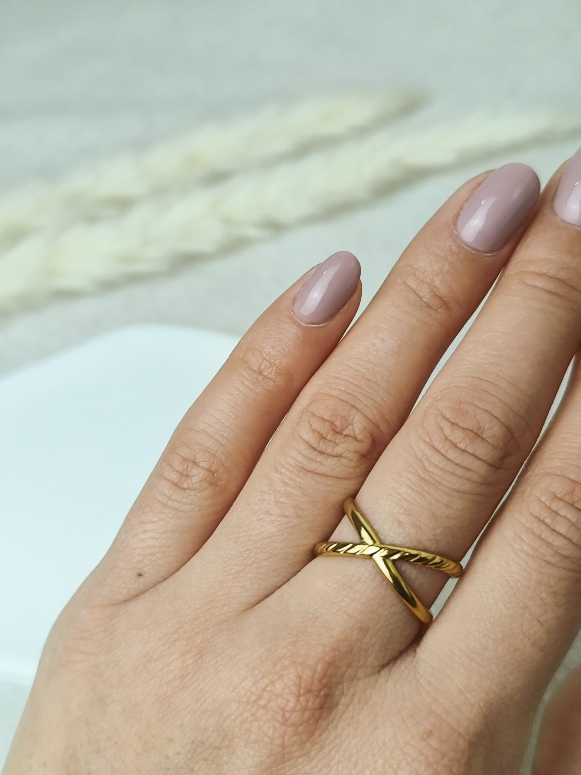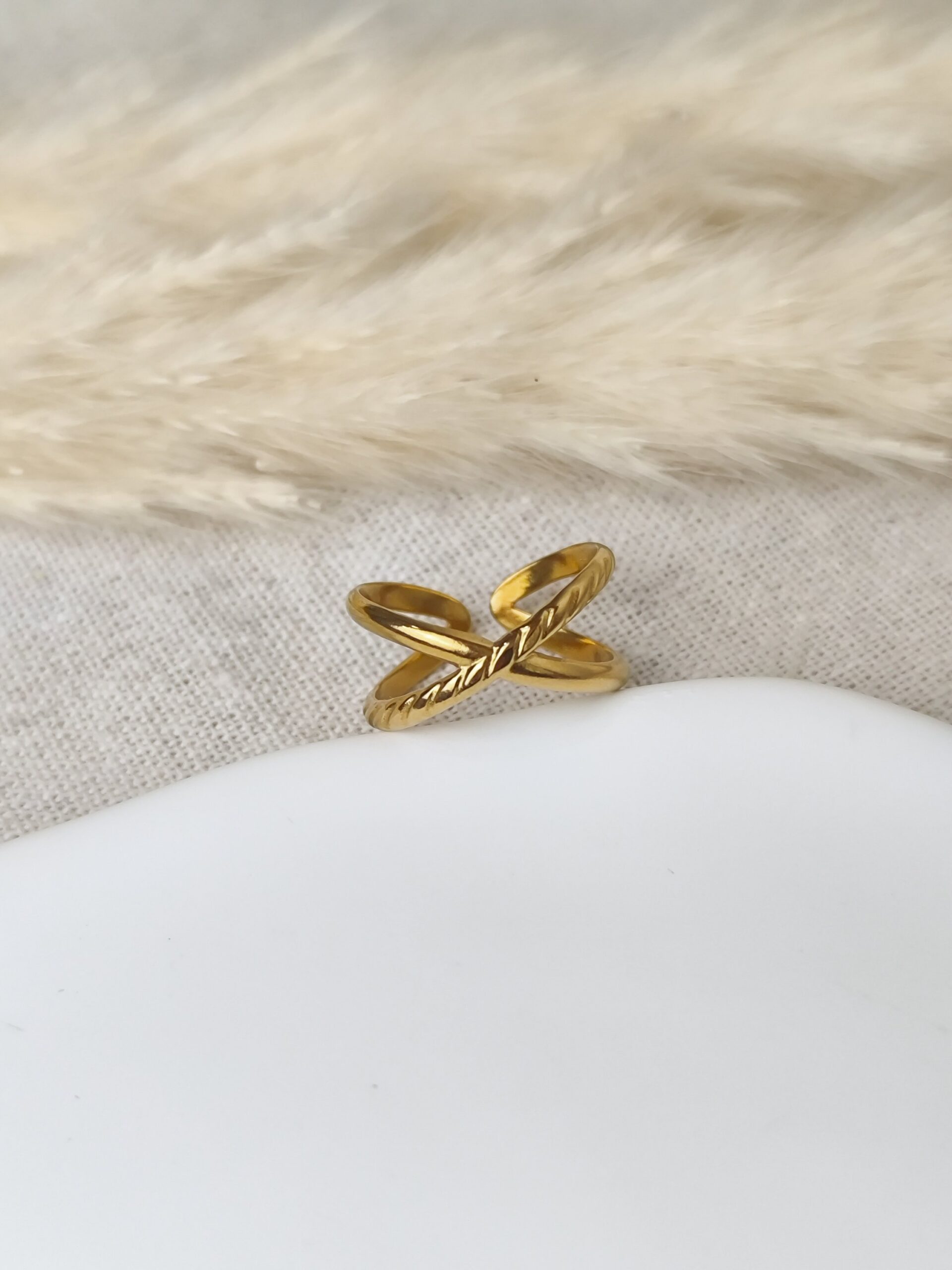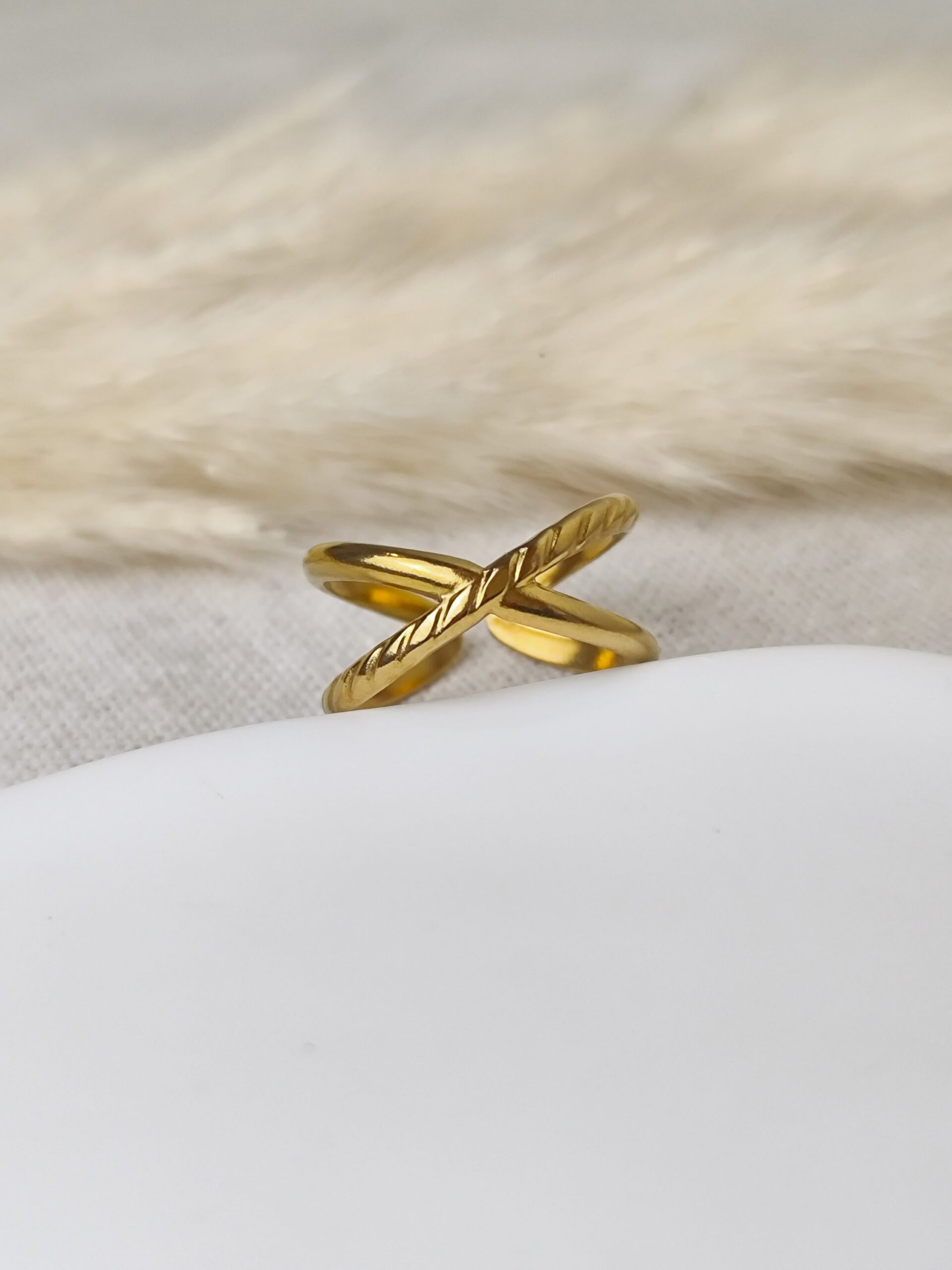 Com um design cruzado de linhas suaves e textura finamente trabalhada, esta peça cria um jogo elegante de volumes e reflexos, revelando um brilho quente e envolvente.
