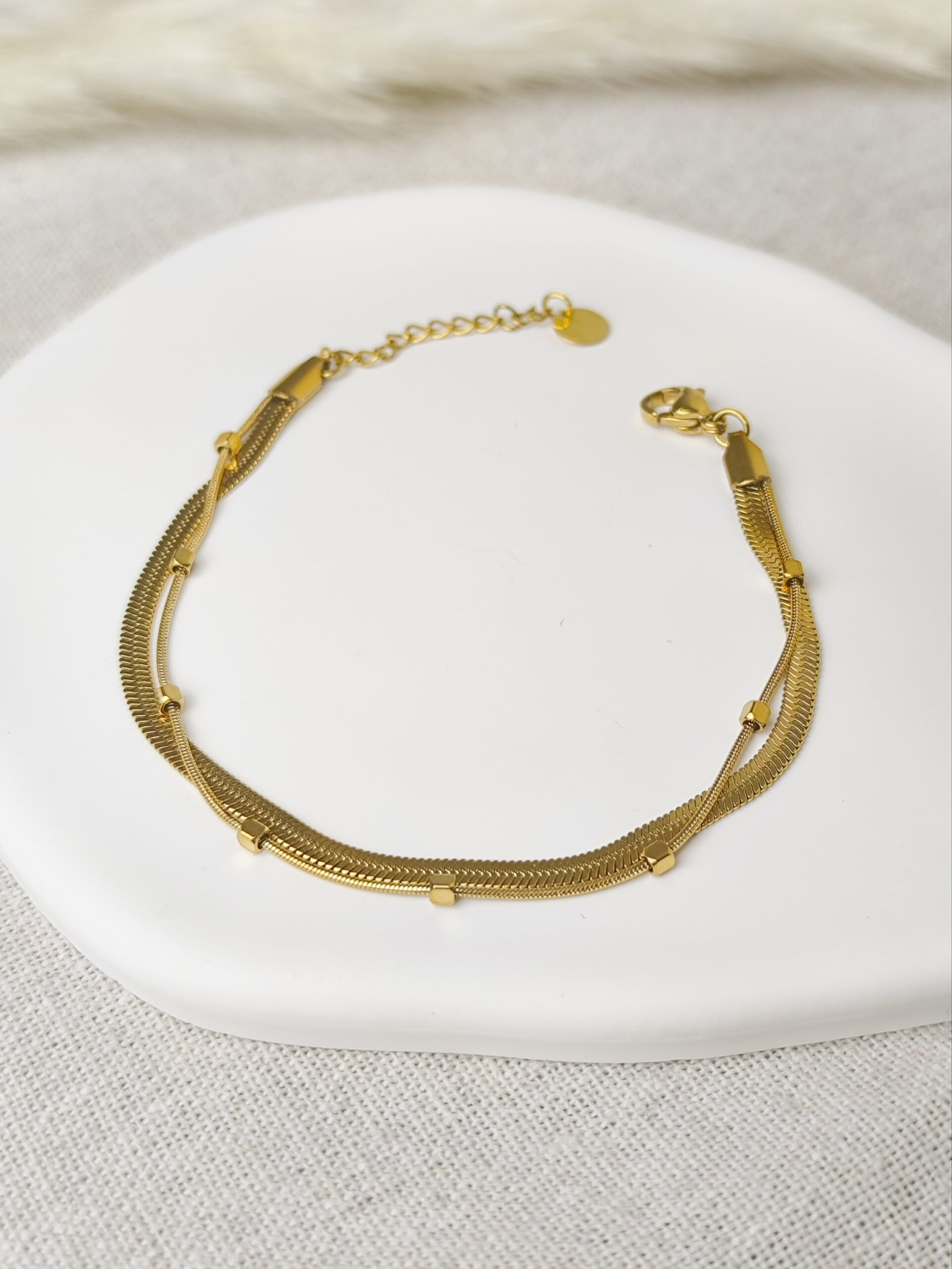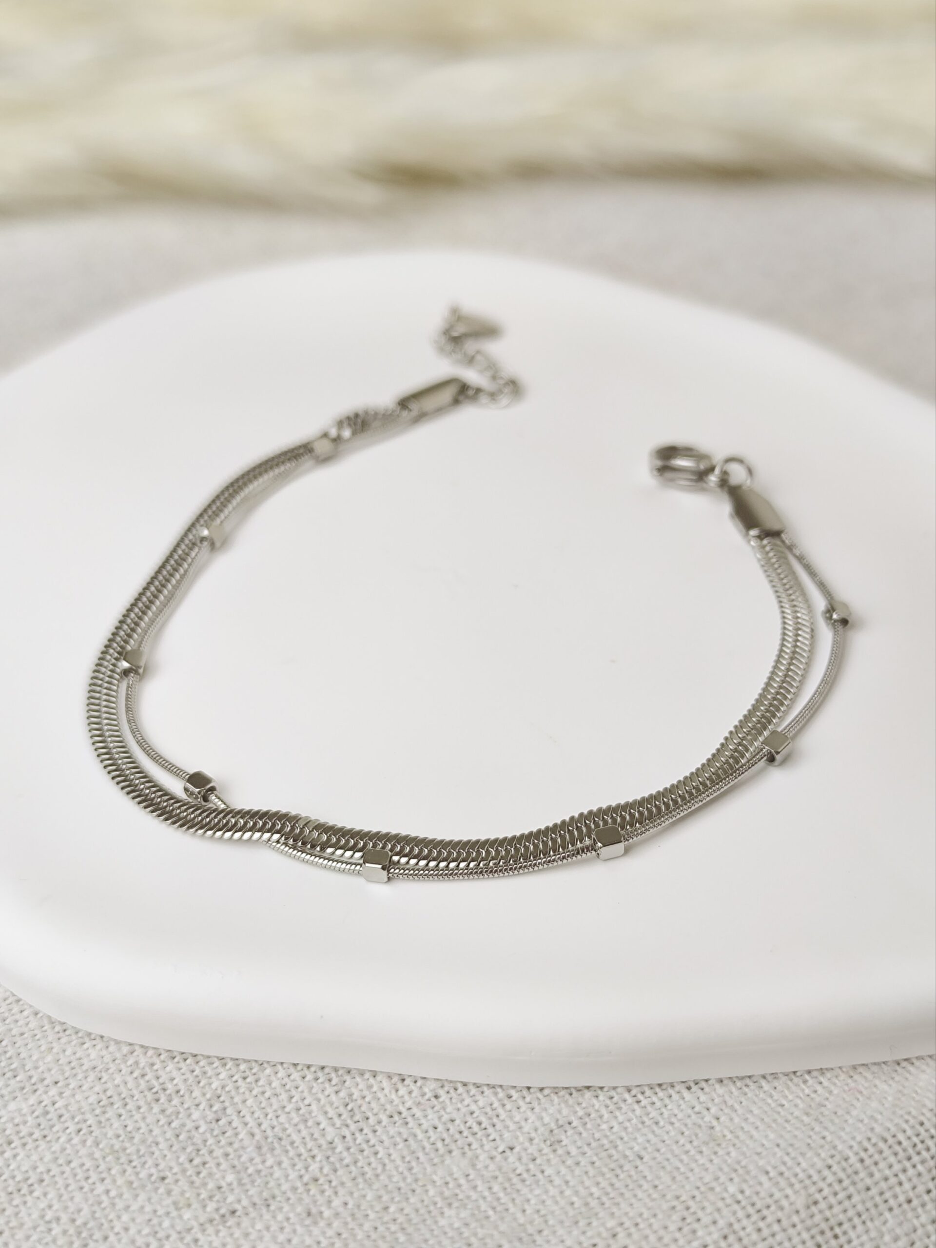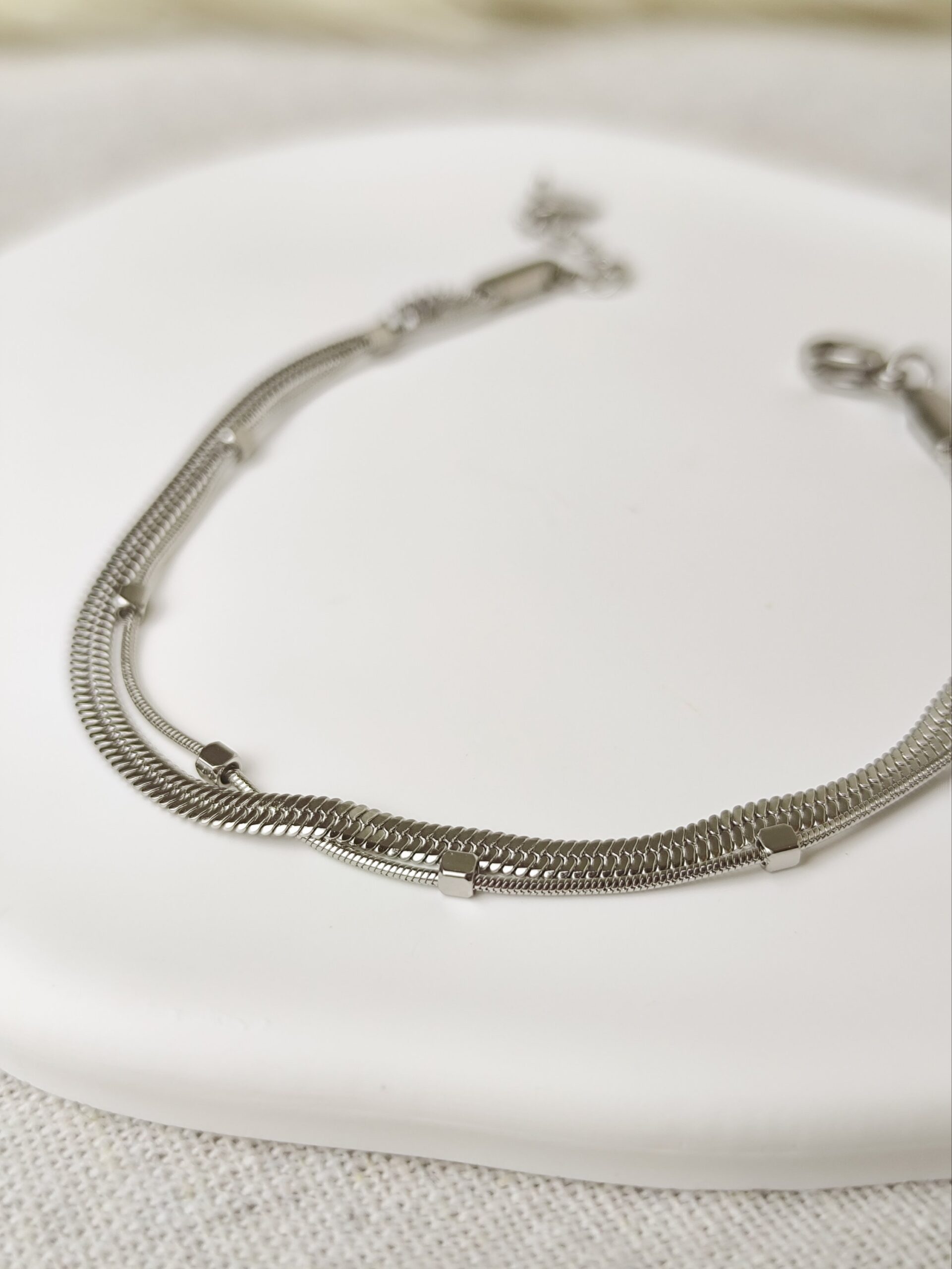 Com duas correntes finas que se entrelaçam com harmonia, cria um efeito subtil de luz e textura.