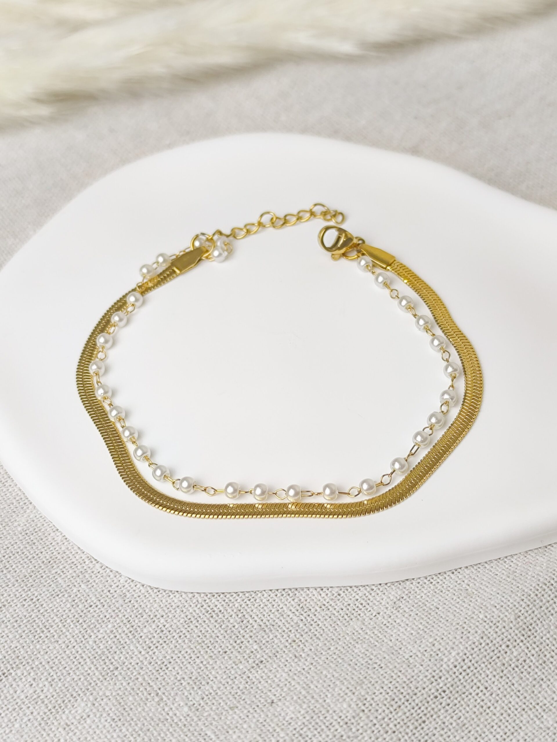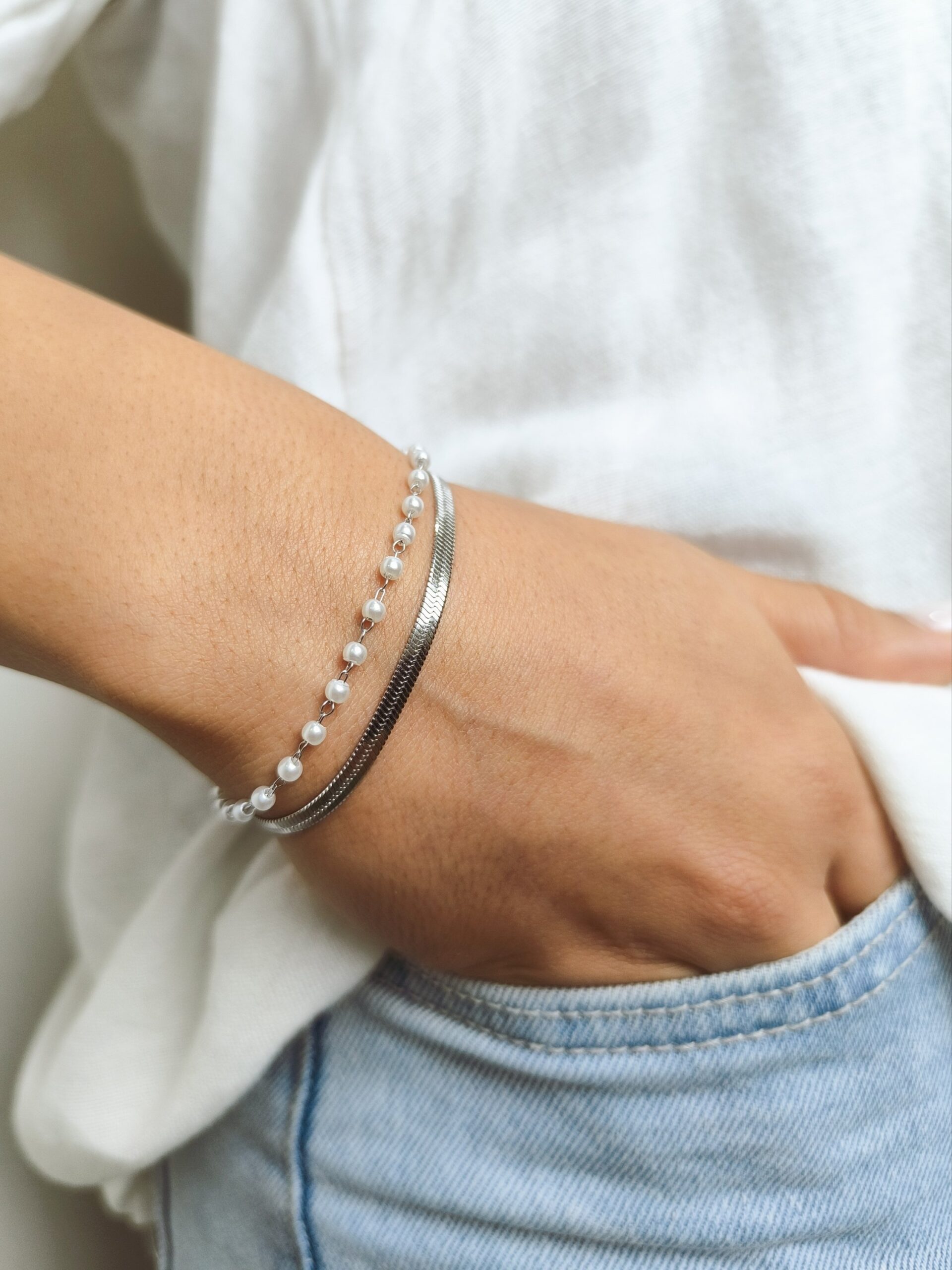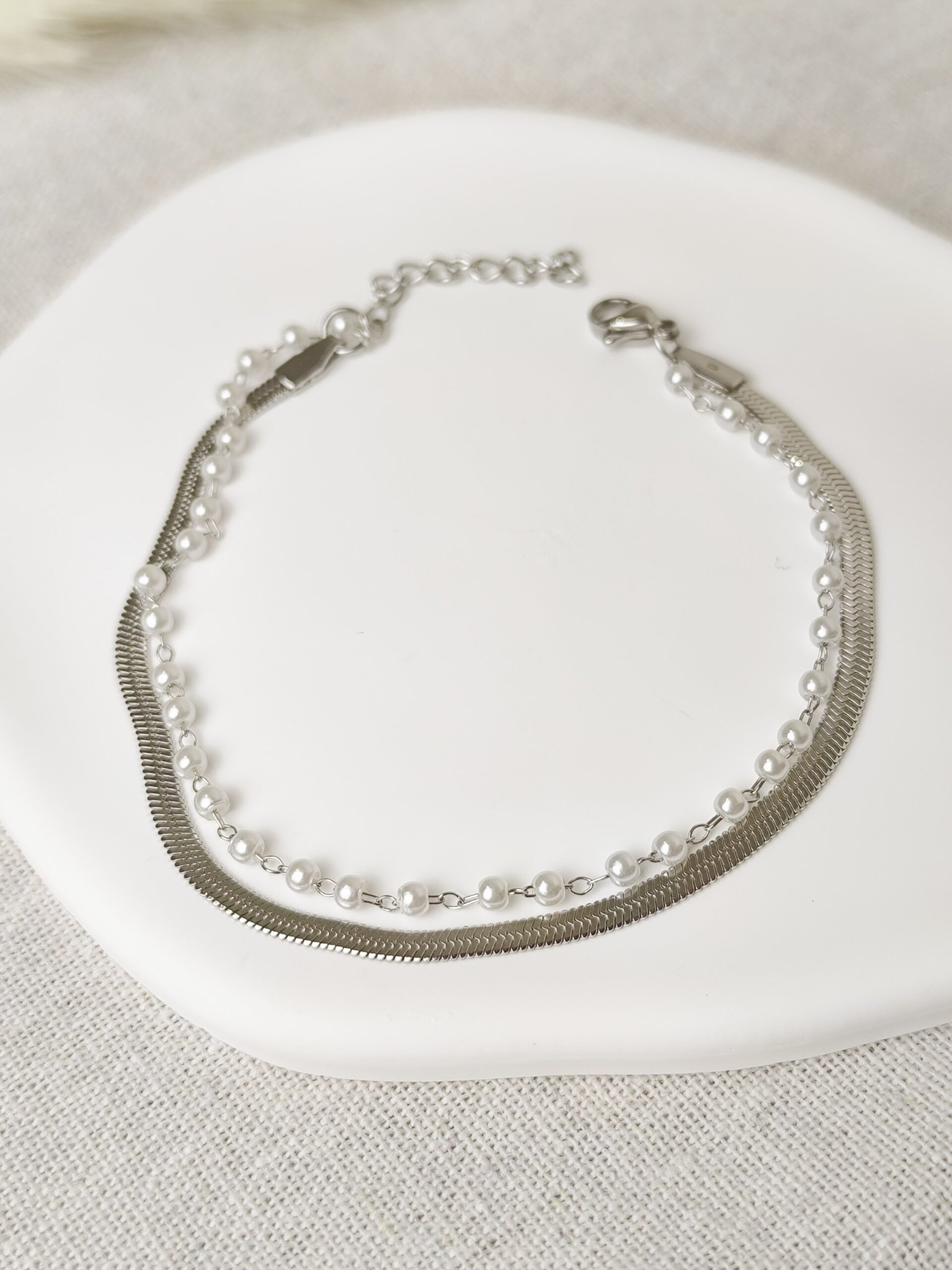 Com duas correntes que se entrelaçam — uma lisa, fluida e luminosa; a outra, pontuada por delicadas pérolas — esta joia reflete a harmonia perfeita entre o clássico e o contemporâneo.