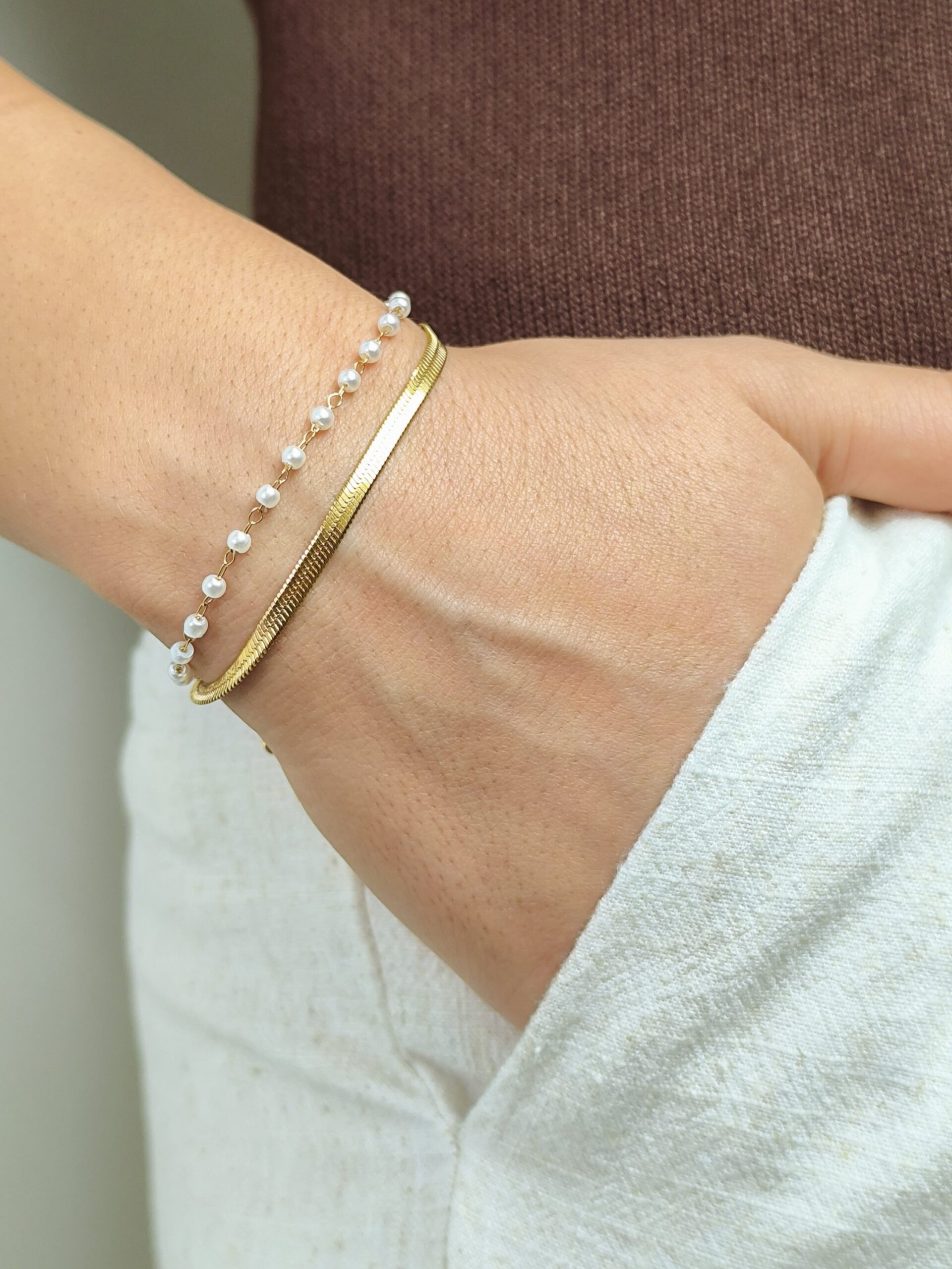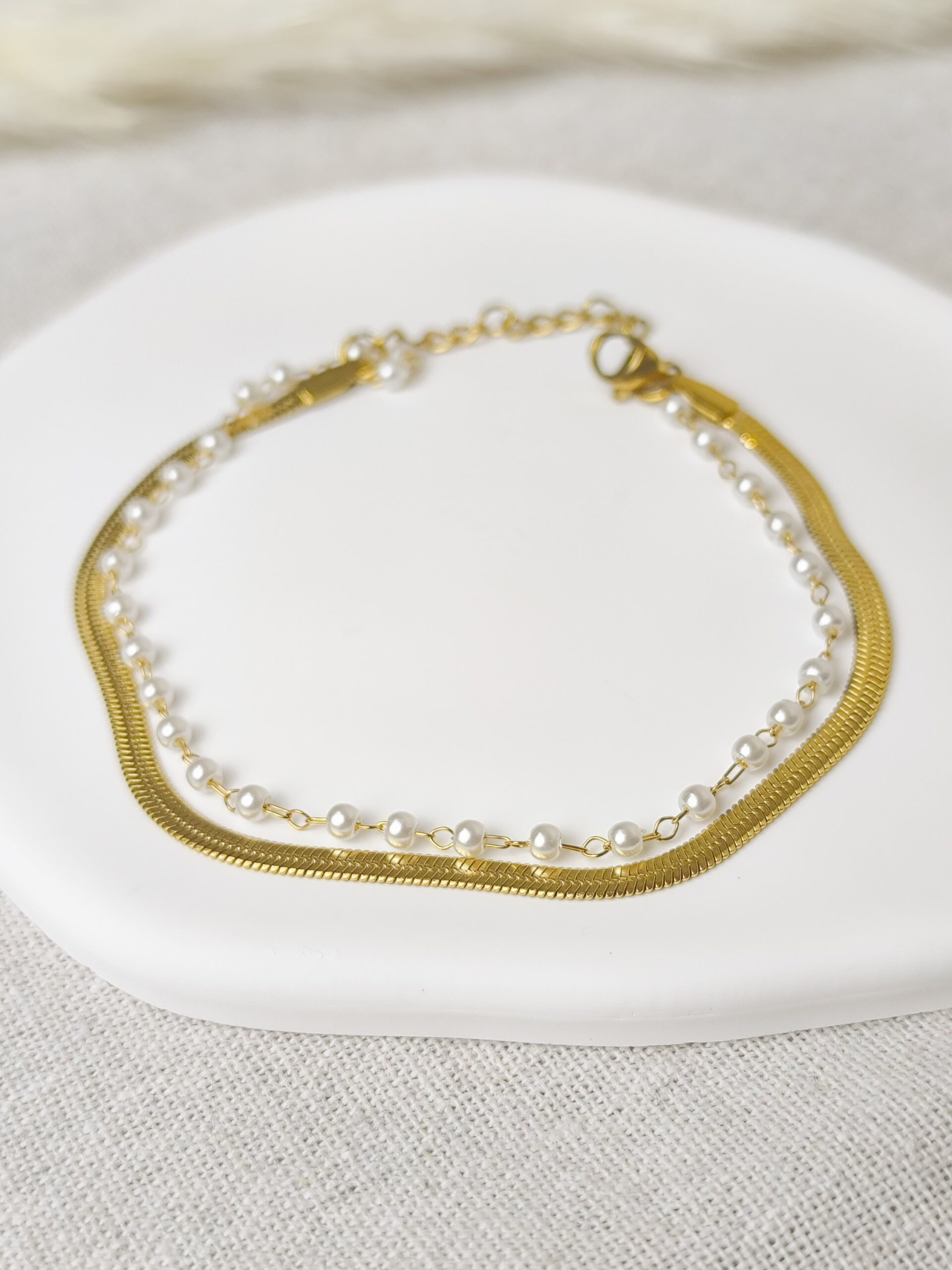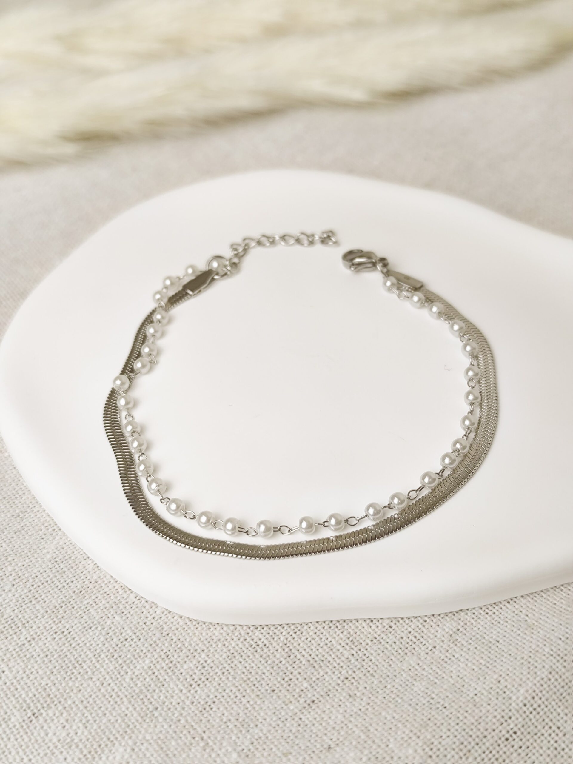 Com duas correntes que se entrelaçam — uma lisa, fluida e luminosa; a outra, pontuada por delicadas pérolas — esta joia reflete a harmonia perfeita entre o clássico e o contemporâneo.